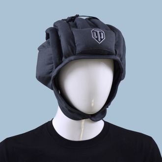 Шапка в виде модели танкового шлема, серого цвета, спереди на уплотнении-защите и сзади вышивка логитипа игры «World of Tanks», внутренняя поверхность шапки из черной бязи, имеется кожаный ремешок-застежка на металлической пряжке.